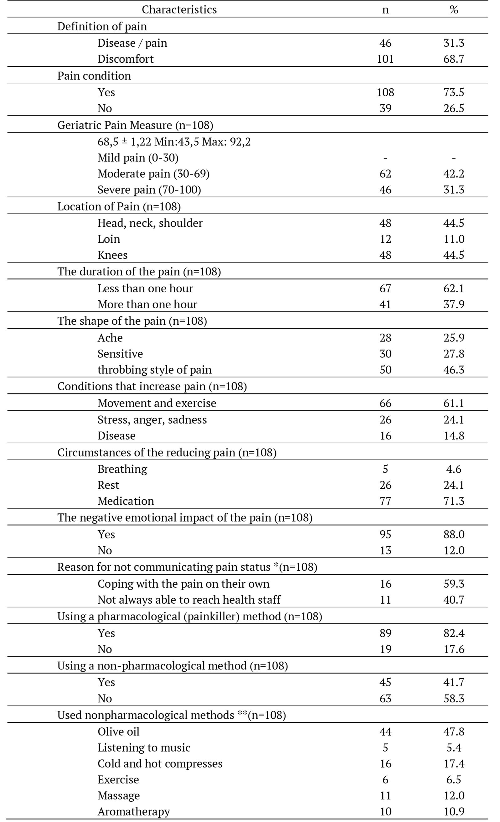 They stated that most of the older adults (88.0%) participating in this study experienced the pain's negative emotional impact. Older adults stated this was coping with the pain on their own (59%). Among the older adults in the nursing home, 69% defined pain as discomfort, with the lowest points of 43.5, highest points of 92.2 and mean 68.5 ± 1.22 points on the Geriatric Pain Measure. Among participants, 42% of them had moderate pain, and 31% of them had severe pain. The features of pain were head, neck, shoulder and knee pain experienced by 44%, pain lasting less than one hour (62%), throbbing style of pain (46%), increasing with movement and exercise (61%), and only relieved by medication (71%). Of the participants, 82% used medication like analgesics, and 42% used non-pharmacological methods like olive oil (48%). The pain experience and features of the participants are shown in more detail in Table 1.