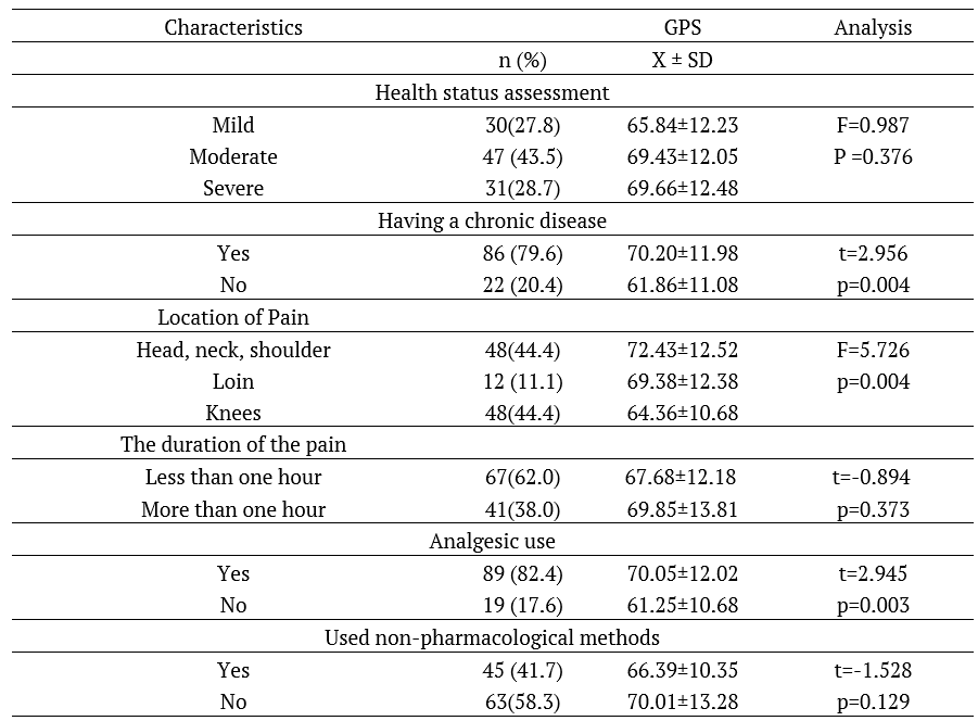 The Geriatric Pain Measure's mean points were higher for those with chronic pain, experienced head, neck and shoulder pain and those using analgesics in the research. There were statistically significant differences identified between mean points (p < 0.05) (Table 2).