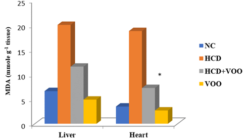 Virgin olive oil showed a strong effect on lipid peroxidation as shown in the Figure 1. A significant reducing (p<0.05) of malonedialdehyde (MDA) concentrations in liver and heart of animals treated with virgin olive oil daily for eight days prior to hypercholesterolimia is observed (11.58 ± 1.13 and 7.25 ± 1.54 nmol g-1 tissue against 20.05 ± 0.96 and 18.80 ± 1.87 nmolg-1 tissue in liver and heart respectively).