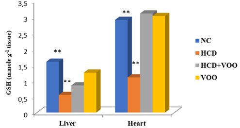 HCD rats show a very significant (p <0.01) decrease in GSH concentrations at 50 days of treatment (0.85 ± 0.55 mM g-1 tissue against 1.59 ± 0.32 mM/g tissue and 1.1± 0.97 mMg-1 tissue against 2.90 ± 1.76 mM g-1 tissue for controls respectively in liver and heart) (Figure 2). The rats post-treated with virgin olive oil show a very significant increase of GSH levels compared to those HCD (1.2 ± 0.98 mM against 1.59 ± 0.89 mM and 2.90 ± 0.77 mM against 3.1 ± 1.02 mM in liver and heart respectively).