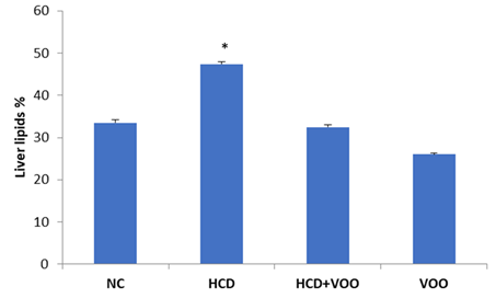 The Figure 3 shows the levels of hepatic lipid of the experimental groups, hepatic lipid was significantly increase (p<0.05) in HCD group (47.4 ± 0.56), nevertheless, there was a significant decrease in the levels of hepatic lipid in rats received virgin olive oil (32.45 ± 0.63) when compared with HCD rats.