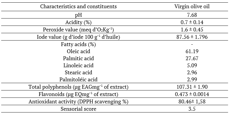 The olive oil used in this study was chosen as the best from twelve other samples collected from different locations in the North-Eastern of Algeria (Jijel, Algeria) and can be considered as appropriate sources of bioactive phytochemicals. The composition was summarized in Table 1.