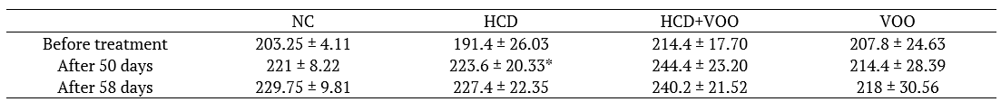 By the end of the 50 days there was a significant increase (p < 0.05) in body weight of HCD rats when compared with NC as presented in the Table 2. The body weight of normal control rats and HCD rats increased by 8.03 and 16.82% after 7th week respectively. While the weight of the HCD+VOO rats increased by 13.99%.