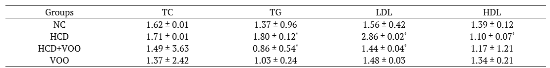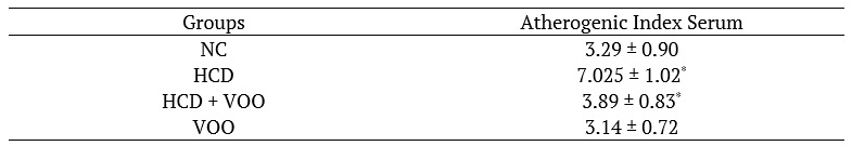 The Atherogenic Index Serum (AIS) of groups are summarized in Table 4. The AIS of HCD rats was significantly increased (p < 0.05) in comparison to NC rats. The group treated with virgin olive oil showed a reduction of AIS when compared with HCD and the value decreased from 7.025 ± 1.02 in HCD group to 3.89 ± 0.83 in HCD+VOO group, equivalent to a reduction of 80.59%.
