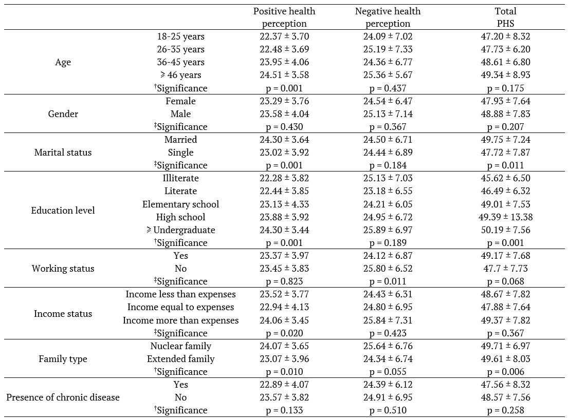 A statistically significant correlation was found between individuals' marital status, gender and family type and overall FRPS, between marital status and family type and ‘task accomplishment’ subscale, and between family type and ‘relationship-related performance’ subscales (p < 0.05) (Table 1). A statistically significant correlation was found between the participants’ age, marital status, education, income status and family type and the ‘positive health perception’, between working status and ‘negative health perception’, and between marital status, education, family type and overall PHS (p < 0.05) (Table 2).