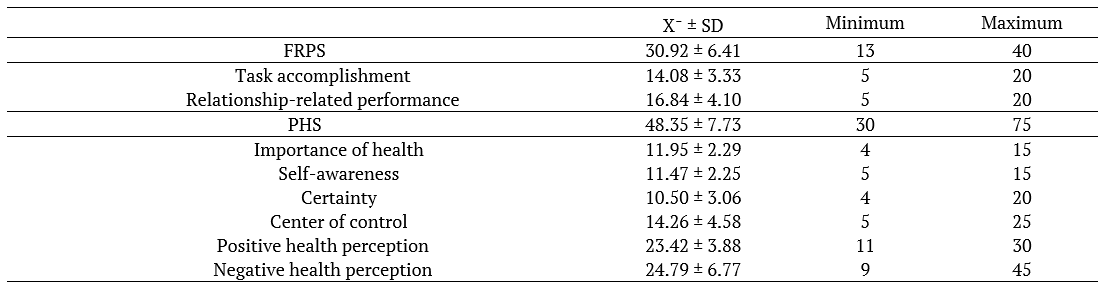 For this study, FRPS total mean score was 30.92 ± 6.41, mean scores of its subscales were 14.08 ± 3.33 for ‘task accomplishment’ and 16.84 ± 4.10 for ‘relationship-related performance’. PHS total mean score was 48.35 ± 7.73, the mean scores of its subscales were 11.95 ± 2.29 for ‘importance of health’, 11.47 ± 2.25 for ‘self-awareness’, 10.50 ± 3.06 for ‘certainty’ and 14.26 ± 4.58 for ‘center of control’. The mean score of ‘positive health perception’ was 23.42 ± 3.88 and the mean score of ‘negative health perception’ was 24.79 ± 6.77 (Table 3).