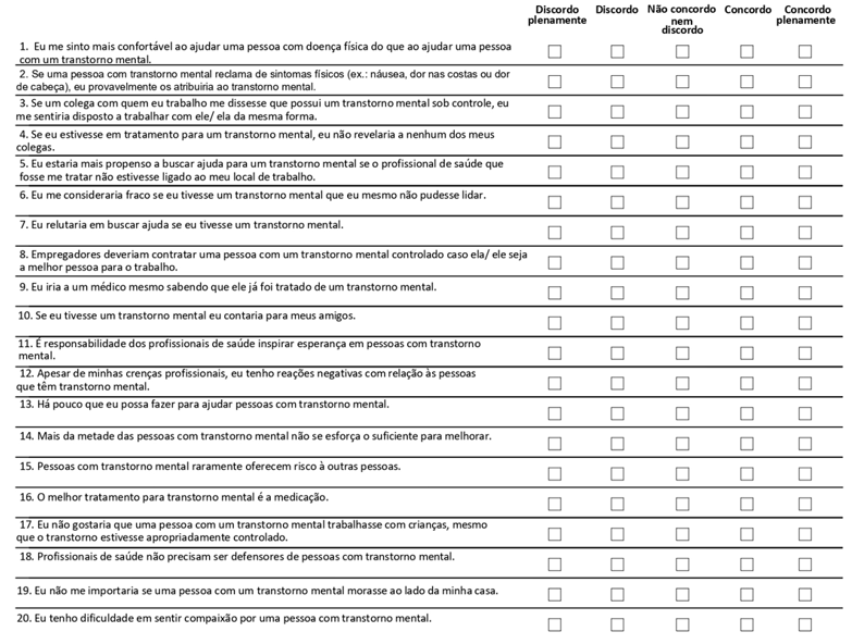 Of the 20 items, eight have been changed due to the agreement of 80% among the judges. In Item 1 there was an agreement to replace ‘ao invés de ajudar’(instead of helping)with ‘do que ajudar’(than helping). Item 2 received the suggestion to change ‘eu geralmente os atribuo’(I usually assign them) to ‘eu provavelmente os atribuiria’(I would probably assign them). In Item 4, the English term ‘colleagues’was understood as ‘colegas’,without relating to people in the workplace. Item 6 ‘Eu me consideraria fraco se eu tivesse um transtorno mental que eu mesmo não pudesse curar’ (I would consider myself weak if I had a mental illness that I could not heal) received the suggestion to replace the verb ‘curar’(heal) to ‘lidar’(deal with), as many mental illnesses have no cure, leading to the understanding, in the mental health field, that people start to live and deal with the mental illness without ever being cured of the illness itself.