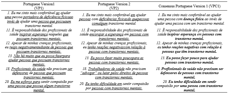 The proposal by Ferrer et al. (1996), who recommends that the step of the committee of judges should be applied before back-translation to enable the identification of errors and/or difficulties in understanding that would be limiting to later steps. Thus, the Consensus Portuguese Version 1 (VPC1), sent to seven bilingual health professionals with experience in mental health, underwent modifications for greater reliability in relation to the Original Version (VO) of the OMS-HC. The changes, in general, were punctual and related to the replacement of certain words by other synonyms for better adaptation. The main changes are shown in Table 2.