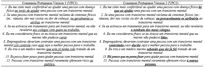In item 8, ‘sob controle’(under control)and ‘esta’(this)were replaced by ‘controlado’ (controlled) and ‘ele/ela’ (he/she), respectively. Item 13 was better understood by the judges by ‘Há pouco que eu possa fazer’(There is little I can do)than by ‘Eu posso fazer pouco’(I can do little). With regard to item 15, ‘Pessoas com transtorno mental raramente oferecem risco ao público’(People with mental illness rarely pose a risk to the public) there was a questioning by the judges regarding the term ‘ao público’(to the public) as not being an adequate expression. Thus, it was replaced by ‘à outras pessoas’(to other people).