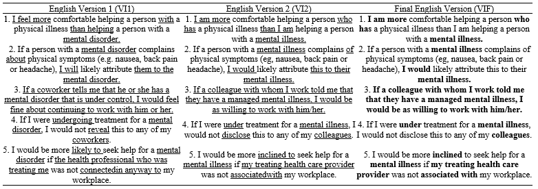 The back-translation process of the Consensus Portuguese Version 2 (VPC2) carried out by two Canadians with knowledge of the Portuguese language led to the Final English Version (VIF) with minor changes. Both translators found the scale understandable and easy to translate. English Version 1 (VI1) used the term ‘mental disorder’, however the term ‘mental illness’ was chosen in the end based on scientific research articles and references from the original scale, which is present in English Version 2 (VI2). Likewise, the term ‘health care provider’ was chosen instead of ‘health professional’. The Final English Version (VIF) was emailed to the author, Dr. Scott Patten. When responding with approval, he commented that the translation was reliable at the original scale. The main changes are shown in Table 3.