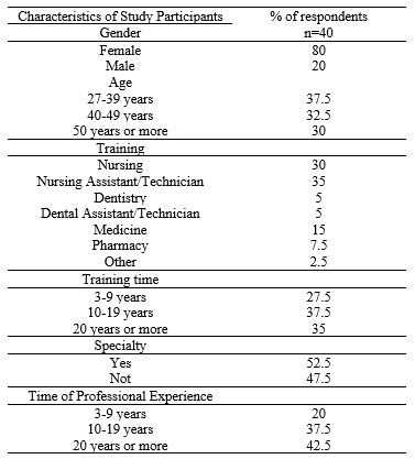 The pre-test was carried out with 40 health professionals, 32 (80%) of which were female and 8 (20%) were male, with an average age of 43.6 years (SD=9.1; range of 27, 4-61.9 years). The average professional training time was 16.5 years (SD = 9.2; range 3-35 years) and, in relation to specialty, of the 40 health professionals, 21 (52.5%) had a specialist degree and 19 (47.5%) did not. The average time of professional experience was 18.2 years (SD = 9.95; range 3-40 years). There was a prevalence of nursing professionals (nurses, nursing assistants, and technicians), (65%).