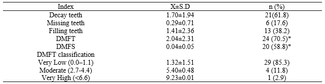 In examination, 61.8% of the students have decayed teeth and 38.2% have filled teeth. The DMFT was 2.04 ± 2.31 with a mean of 1.70±1.94 decayed teeth, a mean of 0.29 ± 0.71 missing teeth and a mean of 1.41 ± 2.36 filled teeth. According to DMFT classification, 85.3% of students have very low risk, 11.8% moderate risk and 2.9% very high (Table 2).