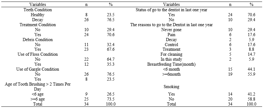 Among the 34 nurse students, 55.9% were women, 44.1% were men. The mean age of the students was 22.5 ± 1.2.It showed dental condition variables of nursing students who voluntary select to course of oral and dental health nursing in Table 1.