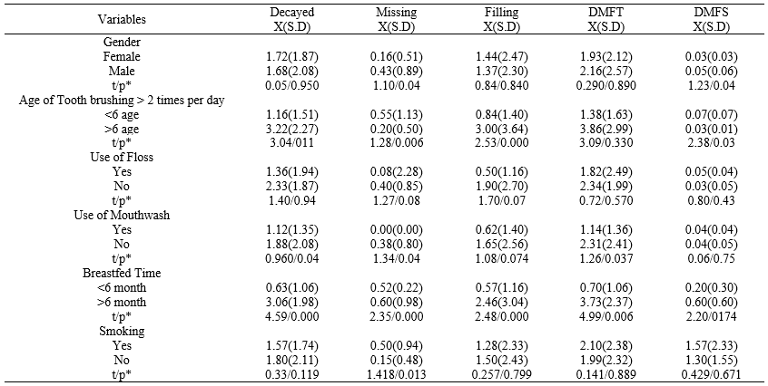 In Table 4, Male students had more missing teeth and mean of DMFS index. Decayed, missing filling and DMFS index were significantly lower in students who <6 years started the brush teeth regularly twice a day. However, the use of dental floss and mouthwash is related also low decayed, missing, filling, mean of DMFT and DMFS index. In additional, students who are breastfed <6 month had significantly low decayed, missing, filling and mean of DMFT index. It has been determined that the mean of missing teeth is high to smokers’ students.