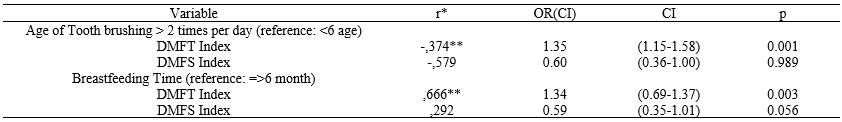 There was negatively correlation between DMFT index and student who did<6 years started the brush teeth regularly twice a day (r:-0,374 p:0.001) and those students had low DMFT index (OR; 1,35). In additionally, there was positive correlation (r:0,666, p:0.003) between students who are breastfed =>6 month and DMFT index. Students who are breastfed <6 month had lower DMFT index (OR;1.34).