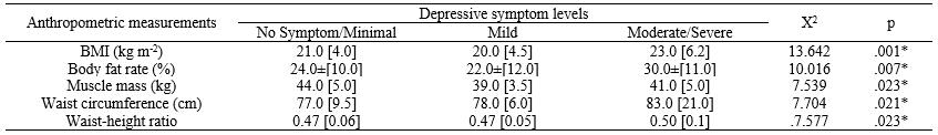 BMI, fat ratio, waist circumference and waist/height ratio values of women with moderate/severe depressive symptoms were significantly higher and muscle mass was lower than those without depressive symptoms (p< .05, Table 2).