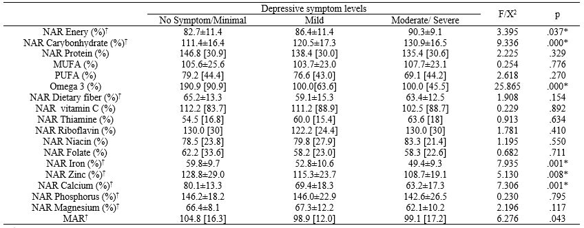 The role of diet in the development of depressive disorders and symptoms has become the focus of recent studies. Poor diet quality has been reported as an important risk factor for depression. There are studies reporting that individuals with depression had low diet quality and that their diet content were poor in terms of protein, vitamins and minerals; rich in saturated fat and simple carbohydrates (Camilleri et al., 2014; Lai et al., 2014). When the diet quality was examined according to depressive symptom levels, MAR scores were found to differ significantly and were higher in those without depressive symptoms (p< .05). This result shows that as the diet quality of the participants increase, their depressive symptom levels decreases and that means more unhealthy foods were in their diet (Rao et al., 2008).