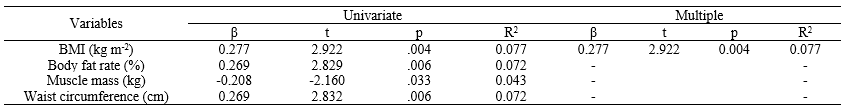 According to the results of the regression analysis, the BDI scores of the women were positively affected by BMI, waist circumference, waist/height ratio, fat ratio values, and negatively affected by muscle mass (p< .05). One-unit change in BMI, fat ratio, muscle mass, waist circumference, and waist/height ratio of women led to a change of 0.277, 0.269, -0.208, 0.269 and 0.226 units in the BDI score, respectively (p< .05). According to the results of the multiple regression analysis performed by including the BMI, waist circumference, waist/height ratio, fat ratio and muscle mass values of the students into the model, it was determined that the effect of BMI alone on the depression score was statistically significant (p< .05). Each unit increase in BMI enhanced the depression score by 27.7%. The BMI's rate of explaining the depression score was 7.7% (Table 4).