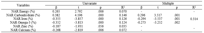 According to the results of the multiple regression analysis performed by including the NAR carbohydrate, iron, calcium and omega-3 scores together into the model, the effect of carbonhydrate score on the depression score was statistically significant and positive (p< .05), while the effect of iron (p< .05) and omega-3 (p< .05) scores on depression score was statistically significant and negative (Table 5).