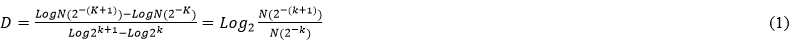 (1)Where D corresponds to the fractal dimension, N is the number of squares occupied by the object and K represents the degree of partition of the grid.