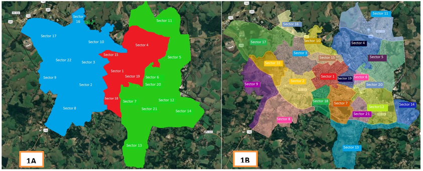 The distribution of the 22 census sectors in the districts of the municipality of Passo Fundo is shown in Figure 1A. The division into 3 groups performed for analysis in this research is shown in Figure 1B.