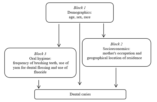The etiology of dental caries is multifactorial; however, some factors are already well established, for example, a high-sugar diet can be directly related to the occurrence of caries. Another factor is the oral hygiene habits such as the frequency of tooth brushing, flossing, and use of fluoride that may be inversely related to the presence of decay. It is also important to note that demographic characteristics and socioeconomic conditions can be determinants of different oral conditions. However, the exact relationship between these determinants is not fully understood, since some individuals present with dental caries despite the absence of the risk factors and others do not develop the disease even when exposed to these factors. Thus, it is possible that depending on the population and their geographic location of residence, there may be a better understanding of the presence of dental caries, which may bridge this gap. To provide an explanation for these outcomes, we chose to select a set of variables for analysis, having their entry in blocks in order (Block 1 - demographic variables: age, sex and race; Block 2 - socioeconomic variables: mother's occupation and geographical location of residence; Block 3 - oral hygiene variables: frequency of brushing teeth, use of yarn for dental flossing and use of fluoride). The final model is based on a theoretical model analysis (Figure 2).