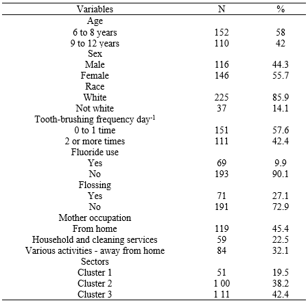 The mean age of the children who were at the Children's Dental Clinic described in the medical records was 9.0 (± 1.9) years. Most individuals were race white 225 (85.9%), whose mothers did not work outside home (119, 45.4%). Regarding oral hygiene, only 42.4% (111) brushed more than twice a day and 27.1% (71) used dental floss. Table 1 describes the results of the patients' socio-demographic and oral hygiene variables.