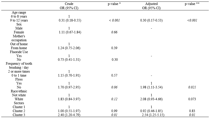For the realization of Binary Logistic Regression, all variables that had an association with p < 0.15 were entered in the crude model: age group, race, flossing and geographic sectors. However, after multivariate adjustment, only the variables, flossing and geographic location of residence (sectors) remained significant (p < 0.05), and race lost membership in the final model adjusted to multivariate regression analysis. Children who did not use the floss had 1.98 (OR=1.98; 95% CI 1.11-3.54) were likely to have more teeth with caries experience. Children who lived in group 3 are 2.54 more likely to greater severity of dental caries (OR= 2.54; 95% CI 1.25-5.15) than the first group. The older age group was a protective factor for dental caries with 30% more chances of not having caries (OR =0.30; 95% CI, 0.17-0.53). The results are shown in Table 3.