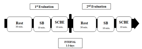 The volunteers were fasting for 8 hours. Before data collection, all volunteers performed three days of controlled breathing adaptation. Data collections (first and second evaluations) were performed within a maximum interval of 3 days between collections (Figure 1). Collections were always performed after spontaneous breathing and after controlled breathing. The volunteers were placed in the supine position and remained in this position for one hour (rest: 30min., data collection: 10min. spontaneous and 10min. controlled breath). The room temperature was maintained between 21 to 24ºC. During the spontaneous breath the volunteers did not suffer any interference, and the breath was monitored between 12 and 20 bpm by visual and multi-parameter monitor (Dixtal, model 2021, Manaus, Brazil) inspection. Data were collected with controlled breath (12bpm; inhalation/exhalation: 2/3) per 10 min.(Nardi et al., 2017; Liu et al., 2016;Stein et al., 2011; Oliveira et al., 2022). The control of breathing occurred through verbal stimulus performed by prior recording.