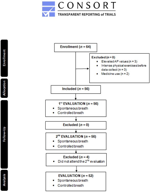 Participants were instructed not to perform exhaustive exercises (48 hours before) and not to drink beverages containing caffeine or alcohol 12 hours before the exams. On the day of the exams, volunteers who presented values of blood pressure above normal (SBP > 120mmHg and DBP > 80mmHg) (Whelton & Carey, 2017), bradypnea (< 12 breaths per minute), tachypnea (> 20 breaths per minute) and tachycardia (> 90 beats per minute) were excluded from the study. Volunteers who reported stressful events and ingest of alcohol beverages that occurred in the last 48 hours also excluded from the study.