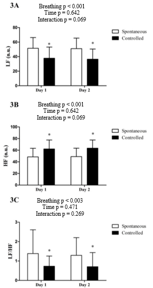 In the frequency domain, controlled breath decreased sympathetic activity (LF) and increased parasympathetic (HF) which modified the heart autonomic modulation (LF/HF ratio). Our results showed controlled breath (12 bpm; inhalation/expiration: 2/3) do not change HRV in time domain. The absence of changes in time domain possibly occurred because of the data collect (10 min. in our research) and, it was recommended at least 24 hours of analyses (Task Force ESC/NASPE, 1996). However, only the square root of the mean squares of successive R-R interval differences (rMSSD) can be considered in a short-term evaluation, in this case, spontaneous is recommended (Melo et al., 2018; Williams et al., 2015), but this variable did not change in this study.