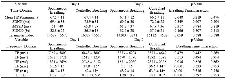 Previous studies in HRV in healthy volunteers showed results only with spontaneous breath (Brown, Barnes, & Mündel, 2014; Landreani et al., 2017; Sima et al., 2017; Williams et al., 2015) and other ones only with controlled breath (Nardi et al., 2017; Liu et al., 2016; Stein, Dal Lago, Ferreira, Casali, & Plentz, 2011; Oliveira et al., 2022), and some studies with controlled and spontaneous breath (Kim, Bae, & Park, 2016; Levin & Swoap, 2019; Melo et al., 2018; Tavares et al., 2017). Other studies evaluated patients with schizophrenia (Liu et al., 2016), hypertension (Li, Chang, Zhang, & Chai, 2018), human immunodeficiency virus (Casarin et al., 2019) and asthma (Franco, Júnior, Signori, Prietsch, & Zhang, 2020), and the results were compared with healthy volunteers. These differences in data collection can interfere in heart ANS activity, because variation and/or the breath control can produce autonomic heart changes (Li et al., 2018).Previous studies (Nardi et al., 2017; Liu et al., 2016; Stein et al., 2011; Oliveira et al., 2022), that even within physiological parameters reduced the respiratory rate (10–12 breaths per minute - bpm), may change the autonomic heart modulation, but the influence of this intervention is not yet determined, requiring further investigation. The objective of this study was to compare the effects of spontaneous (between 12 and 20 bpm) and controlled breath (12bpm; inhalation / exhalation: 2/3) on HRV of healthy young adults.