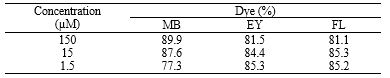 MB in all concentrations presented higher photodynamic potential as PS in relation to the consumption of DBPF when compared to other dyes. Still, the concentrations of 150 μM (89.9%) and 15 μM (87.6%) were the most efficient in the photodynamic potential.