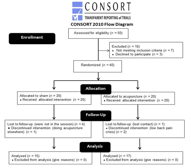 Initially, 50 patients were chosen and 10 were excluded (7 for not meeting the inclusion criteria and 3 for refusing to participate in the study) before randomization. Forty patients were allocated to the study (20 in each group). The sample loss over the course of the study was 20% (8 patients; in sham group: 4 did not return to the sessions and 1 doing acupuncture elsewhere; in acupuncture group: 1 did not return contact and 2 went through an acute crisis of lower back pain), therefore, 32 patients concluded the study. Design and flow chart of the study is shown in Figure 1. During the interventions, the patients reported no adverse events or complications.