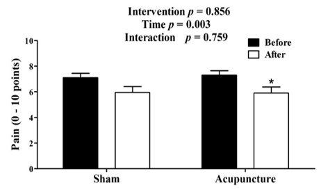 The results of pain are shown in Figure 2. Pain was similar between the groups before (MD: 0.20; 95%CI: -1.12 to 1.52 points) and after (MD:-0.05[95%CI: -1.37 to 1.27] points) interventions. The pain in the sham group did not change (MD: -1.15 [95%CI: 0.18 to -2.48] points) throughout the experiment (before vs after), but in the acupuncture group, this variable decreased by approximately 16% (MD: -1.4[95% CI: -0.06 to 2.74] points).