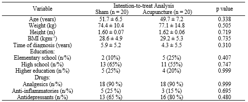 Among the limitations of the study are: out sample loss, small sample size, groups of only women, low number of acupuncture sessions, evaluation of the outcomes immediately after the last session and absence of inflammatory markers assessment. Another limitation to be considered is the segment loss in the sham group (5/20: 25%) and in the acupuncture group (3/20: 15%), however, analysis by "intention-to-treat analysis" attenuates the impact of this effect on the results.