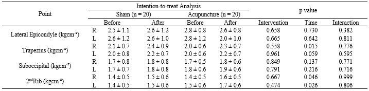 Algometry results are shown in Table 2. The threshold for pain stimulated by pressure on the Lateral Epicondyles (Right and Left) and Suboccipital did not change over the course of the study. This variable did not change in the region of the Left Trapezius, although there was an apparent change in time in the Right Trapezius (p = 0.015) despite not being confirmed by the Bonferroni’s Test (p > 0.05) and confidence intervals in the sham (MD: 0.23[95% CI: -0.11 to 0.58]kgcm-2) and acupuncture (MD: 0.29[95% CI: -0.05 to 0.64]kgcm-2) groups. The 2nd Right and Left Ribs also showed an apparent change over time (p = 0.046 and p = 0.026, respectively), although this was not confirmed by the Bonferroni’s Test (p > 0.05) andthe confidence intervals in the groups. In the sham group the 2nd Right Rib (MD: 0.16[95% CI: -0.09 to 0.43]kgcm-2), 2nd Left Rib (MD: 0.15[95% CI: -0.04 to 0.35]kgcm-2), and in the Right Acupuncture group (MD: 0.16[95% CI: -0.09, 0.42]kgcm-2) and the Left (MD: 0.12[95% CI: -0.07 to 0.32]kgcm-2).
