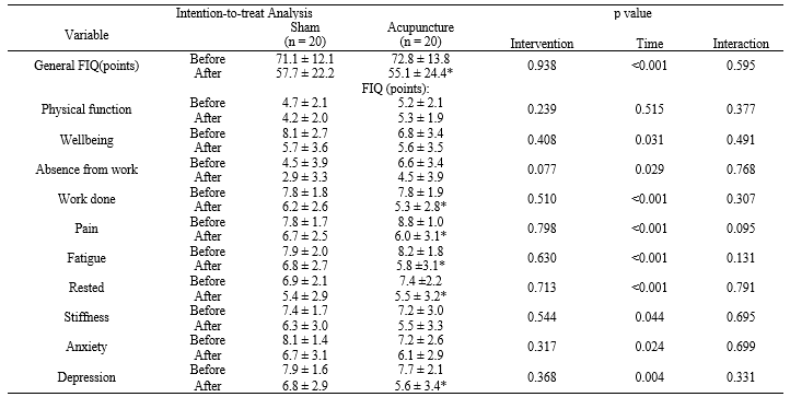 The results of the functional ability and health status of fibromyalgia patients throughout the study are shown in Table 3. The general functional ability and health status showed no difference in interventions (p = 0.796) and interactions (p = 0.45). The over health status in the sham group did not change over the course of the study. However, the functional ability and health status in the acupuncture group (MD: -15[95% CI: -4.2 to -25.8] points) improved by 21% over the course of the study. This improvement in functional ability and health status is due to a 28% improvement in the ability to accomplish work (MD: -2.1[95% CI: -0.8 to-3.4] points), 28% of pain relief (MD: -2.8 [95% CI: -4.4 to-1.1] points), 28% of fatigue (MD: -2.1[95% CI: -1.0 to-3.8] points), 25% in tiredness (MD: -2.1[95% CI: -0.8 to-3.2] points), and 23% in depression (MD: -1.80[95% CI: -0.4 to-3.2] points).