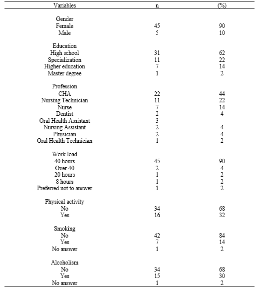 The sample of this study consisted of 50 volunteers with a mean age of 40.1±9.5 years, mean time in the profession of 10.8±7.9 years. Of these professionals, 19 were married (38%), 4 were divorced (8%), 14 were single (28%) and 13 were in a stable relationship (26%). The number of children ranged from one to four, and the majority (48%) was not the main source of family income, but six participants had more than one employment bond (Table 1).