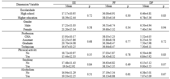 Regarding the results of the prevalence of risk for BS in these professionals, in EE, the mean was 17.6±11.4 points (moderate risk), in DP, the mean was 6.6±5.0 points (moderate risk) and in PF, the mean was 36.8±6.6 points (high risk). There was no statistically significant difference in the comparison between the MBI-HSS results and the sociodemographic variables in any of the three domains (Table 2).