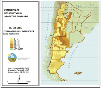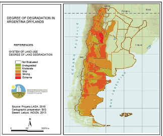 Shows the extent of degradation of dry land inArgentina.
