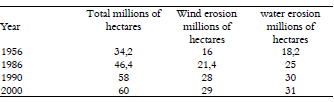 Physical degradation: Because of its importance in the country, it includes water erosion (Figure 3) and wind power (Figure 4), and the deterioration of the soil structure, with phenomena such as the sealing, forming crusts and pans by virtue of the heavy machinery