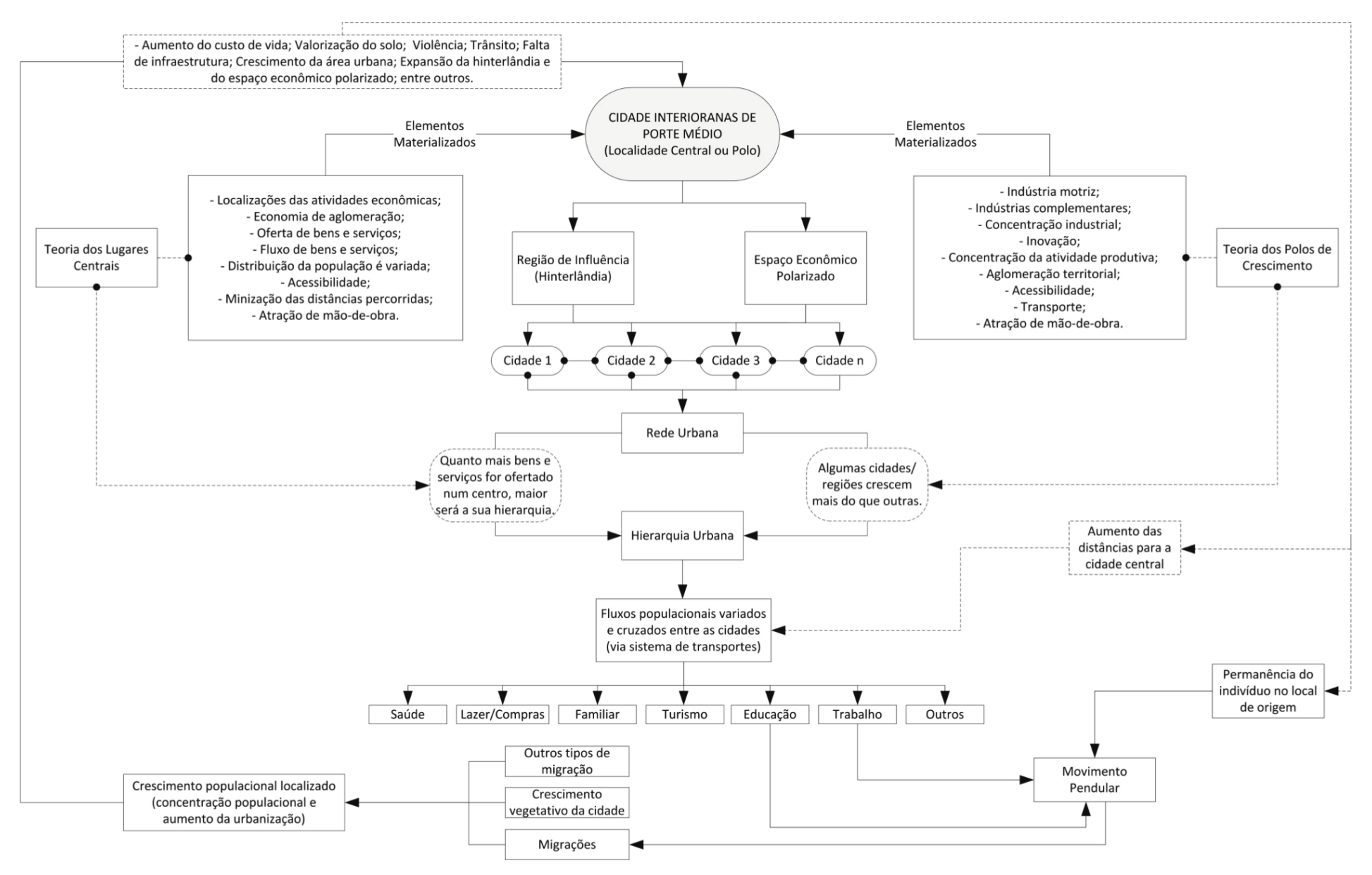Cabe ressaltar que não se sabe muito sobre a influência da rede urbana nos movimentos pendulares em municípios periféricos, porém se sabe que a influência dos polos é inversamente proporcional à distância. A maioria dos estudos e pesquisas ocorre nas áreas metropolitanas, onde as circunstâncias do transporte e do tamanho populacional das cidades são completamente diferentes daquelas existentes em áreas não metropolitanas (Ferrera de Lima, 2012; Vandersmissen, Villeneuve & Thériault, 2003). A importância desses estudos recai sobre o processo de que as distâncias diárias a serem percorridas, a acessibilidade, o tempo de deslocamento necessário para satisfazer as necessidades de trabalho e consumo e as determinações econômicas, podem influenciar diretamente na permanência da população numa determinada região (Antico, 2003).