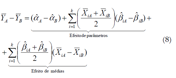 Por fim, a participação de Xk na diferença total dos logaritmos de rendimento entre os dois grupos é dada pela soma do efeito de médias ao de parâmetros, dividida pela diferença total dos logaritmos do rendimento de cada grupo, segundo a Equação 11: