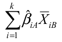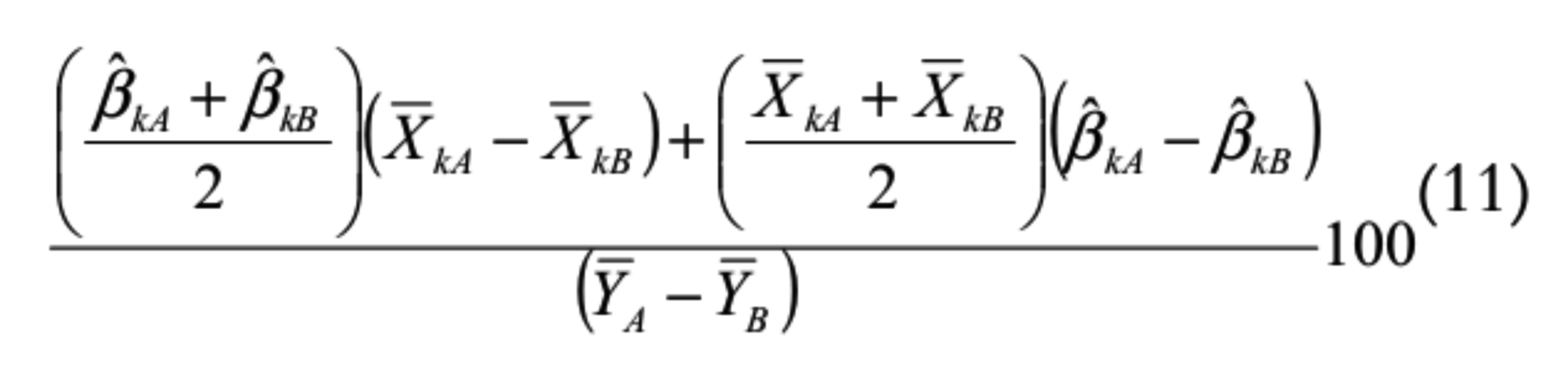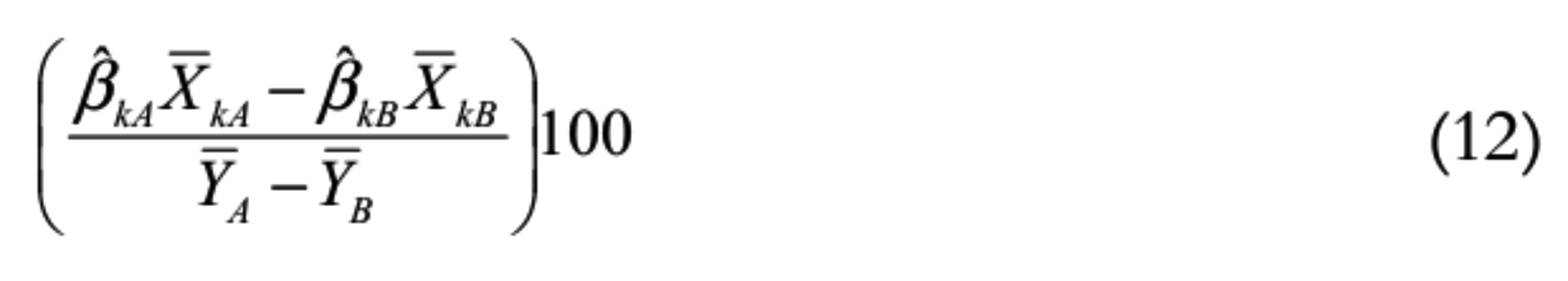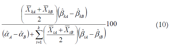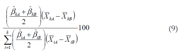 Os dois componentes da decomposição — o efeito de médias e o de parâmetros — podem ainda ser desagregados nas contribuições individuais de cada variável. O efeito de médias associado à variável Xk, por exemplo, é dado por , e seu efeito de parâmetros é . Sua contribuição percentual para o efeito de médias da diferença entre os logaritmos do rendimento de homens e mulheres é dada pela Equação 9: