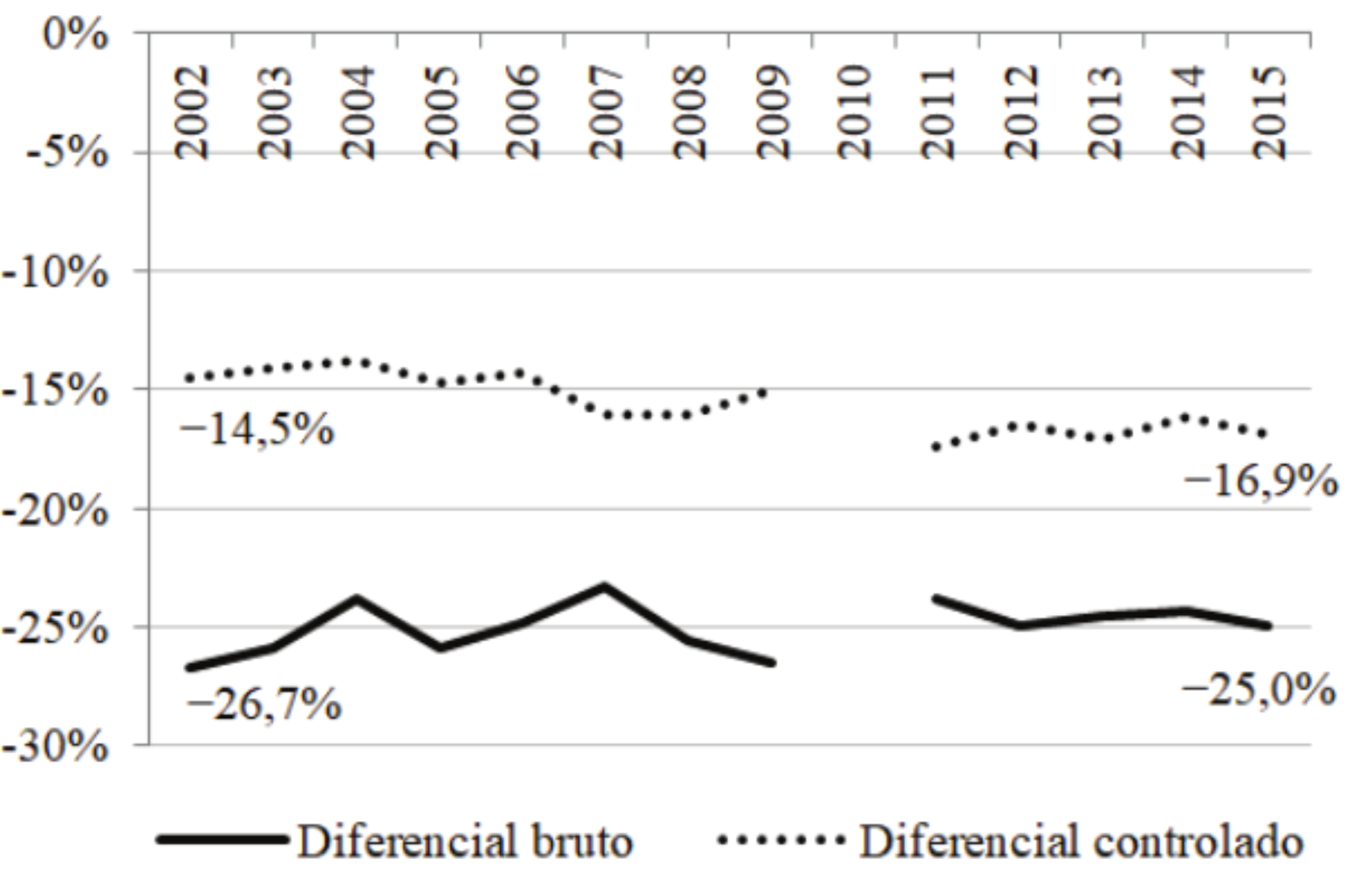 2002 para −25,0% em 2015. Quando controlados os atributos observáveis dos