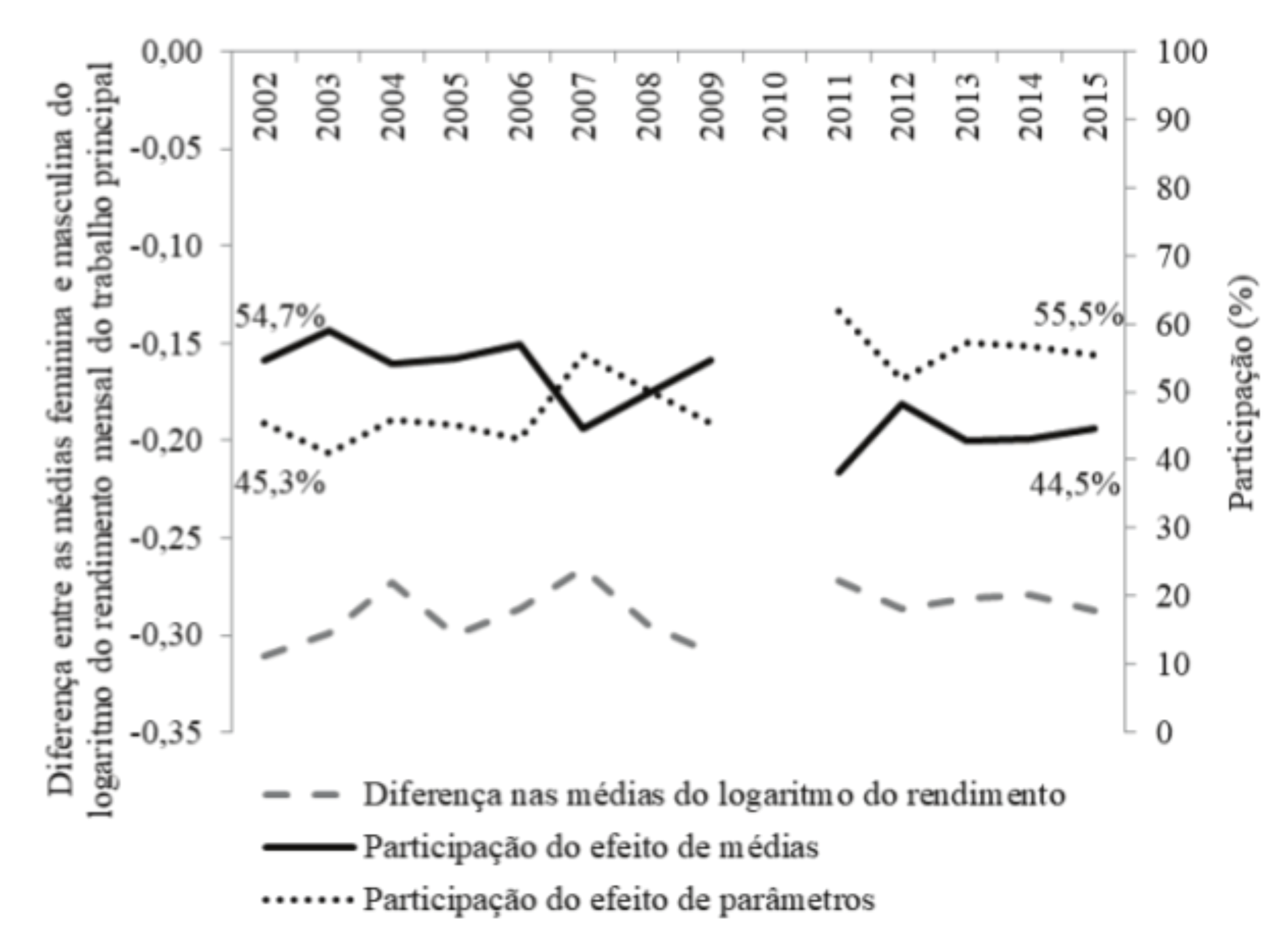 Nesta seção, o diferencial bruto de rendimentos por sexo é decomposto nos efeitos de médias e de parâmetros, de acordo com a metodologia de Blinder-Oaxaca. A Figura 3 traz os resultados dessa decomposição para o período 2002-2015, revelando a participação, em %, de ambos os efeitos para a diferença salarial observada.