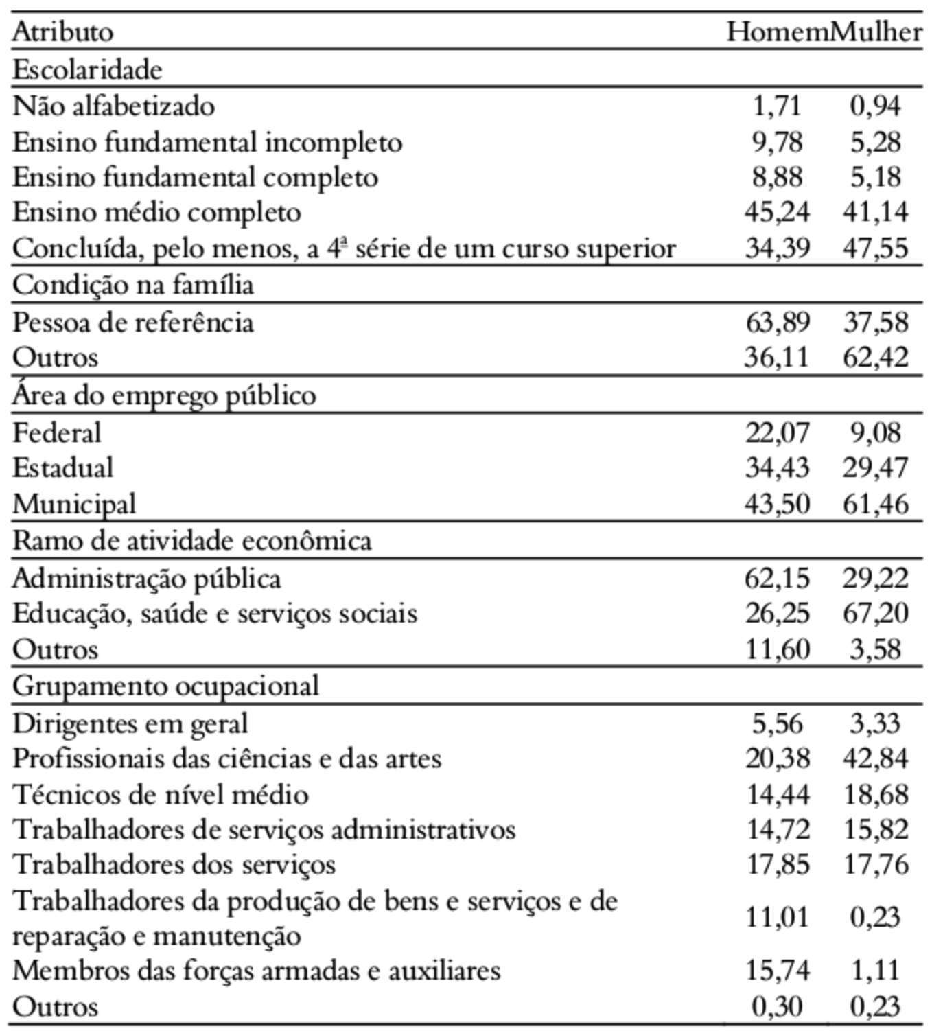 No tocante aos ramos de atividade econômica que compõem o setor público, se considerado o total de funcionárias públicas, 67,2% delas encontram-se ocupadas em atividades relativas à educação, saúde e serviços sociais e 29,2% na administração pública. A distribuição dos servidores do sexo masculino é completamente distinta, com cerca de 62,2% deles alocados na administração pública, 26,3% no grupamento educação, saúde e serviços sociais e os 11,6% restantes distribuídos entre os demais ramos de atividade (Tabela 1). Por conta disso, 39,6% dos postos de trabalho na administração pública são ocupados por mulheres, em face da proporção feminina de 78,1% em educação, saúde e serviços sociais.