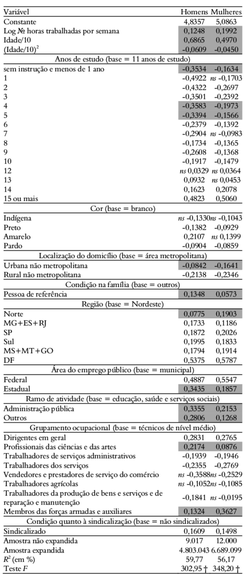 Para a Pnad de 2015, suprimiu-se a variável binária para sexo e estimou-se a equação de rendimento separadamente para homens e mulheres. Os resultados são reportados na Tabela 2. Realizando o teste de Chow, verifica-se que os vetores de coeficientes estimados para cada grupo são, de fato, estatisticamente diferentes (Fcalculado = 20,91, com p-valor < 0,01%), o que indica que parte do hiato salarial observado decorre do fato de se atribuir retornos econômicos diferentes às características analisadas, a depender do sexo do indivíduo. Aplicando testes t a cada par de coeficientes que, nas regressões estimadas em separado para homens e mulheres, associam-se à mesma variável, pôde-se conferir quais deles são, de fato, estatisticamente distintos a um nível de significância de 1% e, portanto, explicam a diferença estrutural observada entre as equações de rendimento de cada sexo. Eles se encontram destacados em cinza na Tabela 2 e serão comentados na sequência.