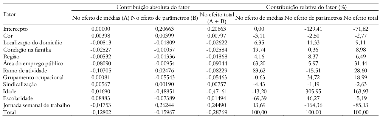 Calcularam-se, para o ano de 2015, as contribuições absolutas e relativas (em %) de cada grupo de variáveis para a diferença salarial total e para os efeitos de médias e de parâmetros (Tabela 3). Quando um fator apresenta participação (%) positiva, ele contribui para aumentar a diferença salarial em favor dos homens, ao passo que um resultado negativo significa uma contribuição para reduzir essa diferença.